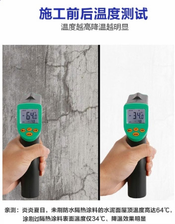 根據(jù)建筑節(jié)能體系計算,大量試驗結(jié)果表明,當太陽反射率和半球發(fā)射率為0.80時,反射隔熱涂料具有明顯的隔熱保溫性能,例如:以南京地區(qū)氣候為代表:當太陽反射率和半球發(fā)射率為0.80時,反射隔熱涂料等效熱阻可以達到0.16~0.20m2K/W(根據(jù)朝向、基層墻體不同有區(qū)別),以廣州地區(qū)氣候為代表:當太陽反射率和半球發(fā)射率為O.80時,反射隔熱涂料等效熱阻可以達到0.15~0.28m2K/W(根據(jù)朝向、基層墻體不同有區(qū)別)。