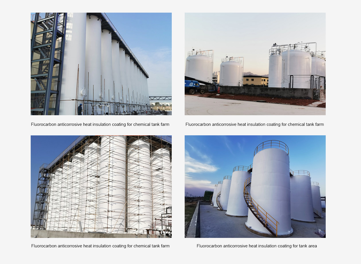 Features: This is a functional anti-corrosion coating with dual functions of anti-corrosion and heat insulation specially developed for special media equipment that chemical companies need to take cooling measures. Through its reflection function of infrared rays, it can achieve the effect of surface cooling. The rate reached over 86%. In the state of steel equipment without medium, the surface temperature of the equipment in summer generally does not exceed 42 degrees, and the effect is very obvious.